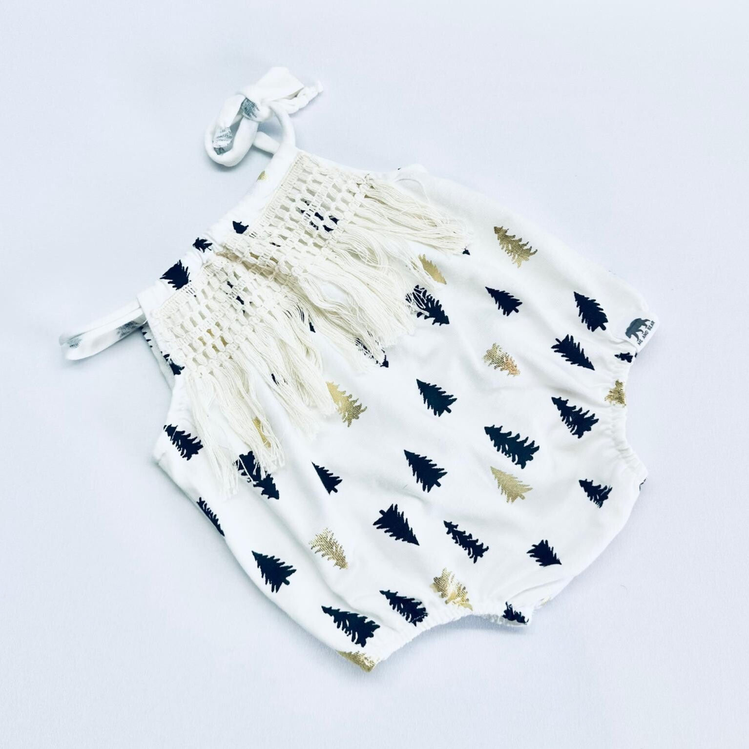 This romper has soft elastic legs with a bow neck tie for long wear and comfort.